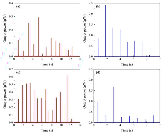 Output power obtained by Fe–Co magnetostrictive fiber integrated shoes; (a) during the usual walking of subject 1, (b) during the usual walking of subject 2, (c) during the walking with legs raised higher in subject 1, and (d) during the walking with legs raised higher in subject 2.
