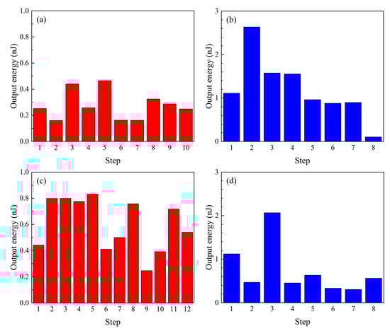 Output energy obtained by Fe–Co magnetostrictive fiber integrated shoes; (a) during the usual walking of subject 1, (b) during the usual walking of subject 2, (c) during walking with legs raised higher in subject 1, and (d) during the walking with legs raised higher in subject 2.