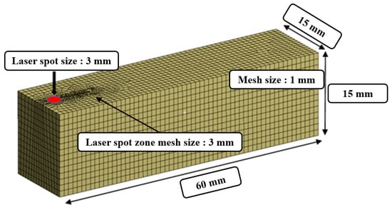 The finite element analysis method is performed to study the overlapping in the laser heat source according to the feed rate. The moving time of the heat source for the analysis was set to be in the range of 10–30 sec by considering the feed rate (f = 100–300 mm/min). The material properties for the analysis are listed in Table 1. The main components of C/SiC composite are reported in Table 2. The preheating temperature was chosen by considering the tensile strength of C/SiC composite material according to the temperature, as shown in Figure 2. The tensile strength of the C/SiC composite decreases at the temperature ranges from the room temperature to 1300 °C []. Additionally, C/SiC composite material has its maximum elongation and minimum tensile strength at a temperature of about 1300 °C. The temperature range of the effective depth of the cut is 1100–1300 °C. To increase the accuracy of the analysis, the mesh elements are divided into squares of 1 mm and the preheated sections are localized at a mesh size of 0.5 mm. The mesh consists of 66,267 nodes and 16,425 elements. Figure 3 shows the analysis model of the specimen and shows the shape of the generated mesh.