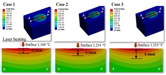 The finite element analysis result, the temperature distribution for the section view of the workpiece was used to determine the effective depth of cut according to preheating temperature. The effective depth of the cut is selected to be the depth at the temperature range of 1100–1300 °C where the strength of the material decreases. The analysis result, the effective depth of the cut was determined to be in the region of 0.2–0.4 mm at a preheating temperature range of 1100–1300 °C. Figure 4 shows the finite element analysis results, and effective depth of cut according to the preheating temperature.