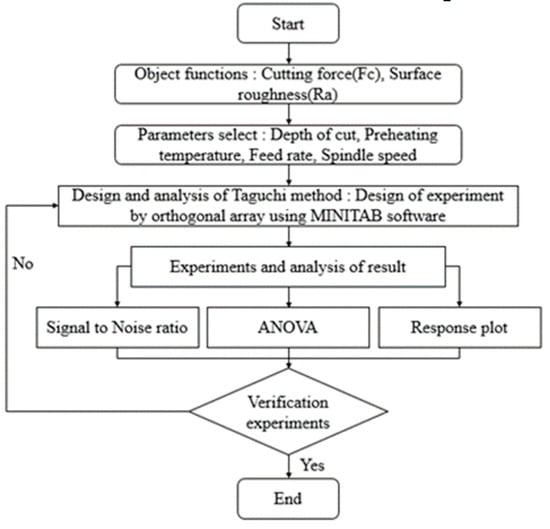 The design of the experiment was performed to determine optimal machining conditions for the LAM of C/SiC composites. The object functions are selected as cutting force and surface roughness. The parameters such as depth of cut, preheating temperature, spindle speed, and feed rate are selected. The depth of cut is determined by the results of finite element analysis. Figure 5 shows the flow chart of the design of experiments for the LAM of C/SiC composite.