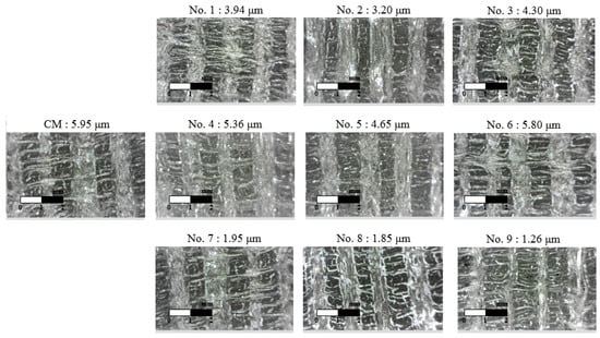 In LAM, machining characteristics of C/SiC composite are affected by various factors. To analyze the influence of the factors on the machining characteristics, the experiments should be performed after considering all the combinations of factors. However, in this case, the number of experiments increases and it is costly and time-consuming. Therefore, the design of experiment should be performed to reduce the cost and time. The experimental design proposed by the Taguchi method uses orthogonal arrays to organize the parameters that affect the process and varies the levels of those parameters. The Taguchi approach values the importance of the logic of the parameters and has a strong effect compared to actual experiments [,,,,]. The Taguchi method used signal to noise (S/N) as a quality characteristic. The S/N ratio characteristics can be divided into three types: nominal-is-best characteristics, larger-the-better characteristics, and smaller-the-better characteristics. In this study, the smaller-the-better characteristics were used. The smaller-the-better characteristics are shown in Equation (1).
