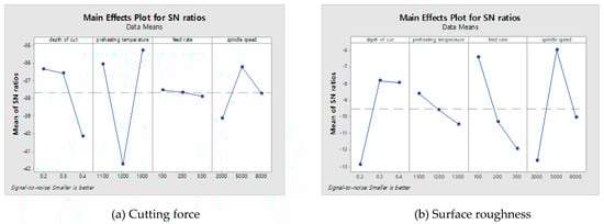The cutting forces were measured using a tool dynamometer during the machining of C/SiC composite material. The surface integrity was analyzed by the surface roughness measurement device and a field emission scanning electron microscope (FE-SEM). All experiments were repeated three times. The cutting force was calculated by the average value of each experiment and the surface roughness was used as the lowest value of each experiment. Figure 7 shows the microphotographs of the machined surfaces of C/SiC composite material in all experiments. Table 6 shows the measured cutting force and surface roughness according to the four factors of the machining conditions. In LAM, the cutting force was decreased by about 40.7% and the surface roughness was decreased by about 33.8%, compare to the CM. The lowest cutting force value at A2B3C1D2 was 42.25 N, and the surface roughness of the S/N ratio had the highest value of −32.5165 dB. Figure 8a shows that the optimal levels were found to be A2 (depth of cut: 0.3 mm), B3 (preheating temperature: 1300 °C), C1 (feed rate: 100 mm/min), and D2 (spindle speed: 5000 rpm). The lowest surface roughness value at A2B3C1D2 was 1.26 μm, and the surface roughness of the S/N ratio had the highest value of −2.0074 dB. Figure 8b shows the optimal levels were found to be A2 (depth of cut: 0.3 mm), B3 (preheating temperature: 1300 °C), C1 (feed rate: 100 mm/min), and D2 (spindle speed: 5000 rpm). Table 7 and Table 8 shows the response table mean S/N ratio for the cutting force and surface roughness according to the machining conditions.