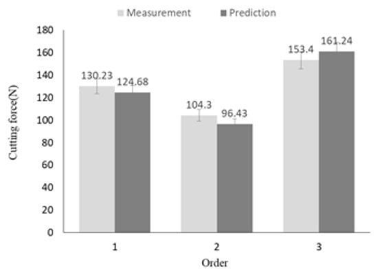 - The verification experiment was performed to construct the predictive equation and to ensure the reliability of the predictive equation. The verification experiment confirmed that the maximum error was 7.55% between the prediction equation for cutting force and measurement experiment value. The maximum error was 8.76% between the prediction equation for surface roughness and measurement experiment value. The prediction equation demonstrated the reliability of low error.