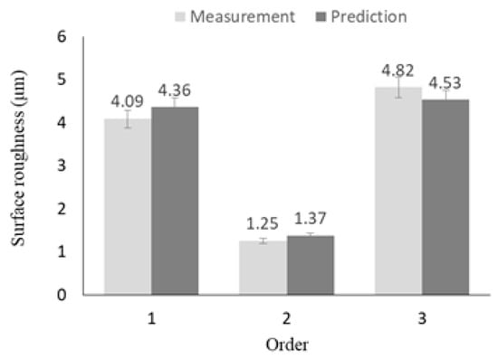 where, Fc represents the cutting force, and Ra represents the surface roughness. Table 13 shows the machining conditions of the confirmation experiment. The three experiments were conducted by randomly adding four machining conditions, including optimal machining conditions (Exp. No. 1) and the main effect of surface roughness (Exp. No. 2), are deducted in Table 13. All experiments were repeated three times. Figure 9 shows the comparison of the results of the prediction equation and the confirmation experiments for the cutting force. As a result of the comparison, the maximum error rate was confirmed to be approximately 7.55%. Figure 10 shows the comparison of the results of the prediction equation and the confirmation experiments for the surface roughness. As a result of the comparison, the maximum error rate was confirmed to be approximately 8.76%. Confirmation experiments were conducted to verify the optimal machining parameters.