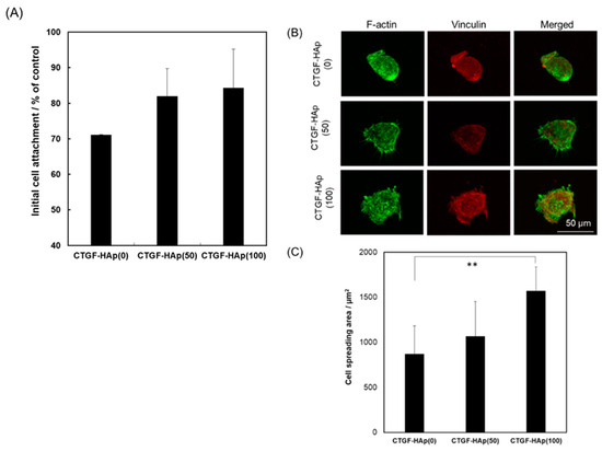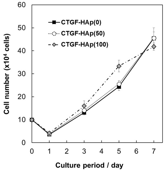 The initial cell attachment is an important step for subsequent behavior of cells. The interaction between materials and cells contributes to the success of regenerative therapeutics. Cells were seeded on CTGF-loaded HAp ceramics to examine the effect of CTGF on cellular attachment to the substrate. At 5 h after seeding, cells were detached from each ceramic and counted by hemocytometer. As a result, the higher cellular attachment can be attributed to the increase with CTGF concentration (Figure 1A). However, there were no significant differences among each disk. After 24 h immersion in the culture medium, we could detect a small amount of CTGF, which was not enough to promote cellular attachment (Figure S1) [17]. Furthermore, to assess the ability to promote cell adhesion through the integrin by CTGF, we explored actin cytoskeleton. We could see cells with a large spreading area per individual cell on the CTGF-loaded HAp ceramics, especially CTGF-HAp(100), while cells on HAp ceramics had a small spreading area and a more rounded morphology (Figure 1B,C). These results suggest that immobilized CTGF on HAp ceramics could enhance cellular attachment through interaction with integrin [18].