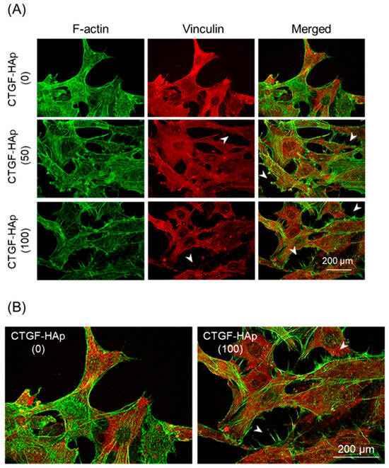 Immunostaining and fluorescence images of cell attachment at 24 h after plating. (A) Actin filaments were visualized with Alexa 488 phalloidin (green). Cells on CTGF-HAp ceramics were also immunostained with primary antibody against vinculin, followed by Alexa Fluor®594-conjugated secondary antibody. (B) Comparison with CTGF-HAp(0) and (100), regions in Figure 2A (merged) are magnified as insets. Arrowheads indicate filopodia-like structure. Bars represent 200 μm.
