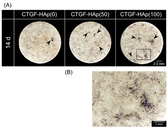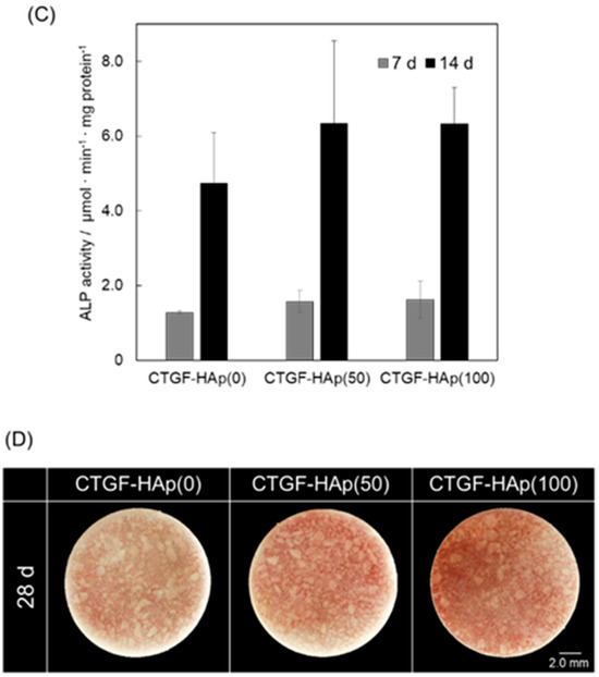 Previous studies showed that CTGF enhanced osteogenesis and chondrogenesis [14]. To investigate the efficacy of osteogenic ability by loading CTGF, MC3T3-E1 cells were cultured on CTGF-HAp ceramics for 14 or 28 days and stained with alkaline phosphatase (ALP) or Alizarin Red. We observed some cell clusters with strong staining on the CTGF-HAp(50, 100) ceramics; whereas, there were cells with very weak staining in the control culture (CTGF-HAp(0)) (Figure 4A). Especially, CTGF-HAp(100) increased ALP activity in cluster regions (Figure 4B). Additionally, ALP activity was also measured on day 7 and 14 (Figure 4C). The ALP activity of cells cultured on each ceramic significantly increased at day 14. In particular, cells cultured on CTGF-HAp(50, 100) had a higher ALP activity than control. However, statistical differences were not seen among the three samples. Furthermore, to evaluate calcium deposits in cell culture, cells were then stained with alizarin red solution.