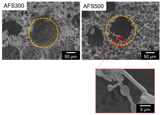 SEM images of AFS300 and AFS500 with two types of pores. Yellow circles indicate macro pores and red one represents micro pores. Scale bars represent 5, 50 μm, respectively.