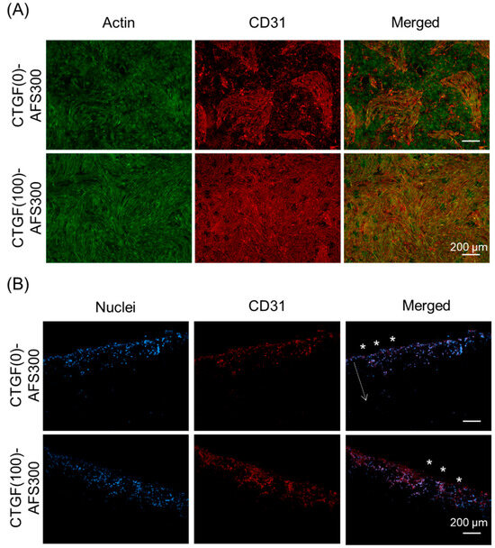 Immunostaining and fluorescence images of cellular distribution and penetration in AFS300. (A) Two kinds of cells (MG-63 and HUVEC) were co-cultured in three-dimensional porous scaffold for 14 days. F-actin was visualized with Alexa Fluor®488-labeled phalloidin (green). CD31 as a marker of endothelial cells was immunostained with primary antibody against CD31, followed by Alexa Fluor®594-conjugated secondary antibody (red). Experiments were repeated three times and run in triplicate. (B) MG-63 and HUVEC were co-cultured in AFS300 for 14 days. Samples were immunostained with CD31 (red fluorescence, endothelial-specific) and nuclei were counterstained with DAPI (blue fluorescence, MG-63 and HUVECs). The Z-axis images show the three-dimensional distribution of cells. Asterisks represent the surface of scaffold and cells penetrated the inner part of the scaffold, as shown by the arrow. Scale bars indicate 200 μm. Experiments were repeated three times and run in triplicate. The distances from the surface of CTGF(0)-AFS300 or CTGF(100)-AFS300 were measured by ImageJ (Figure S3).