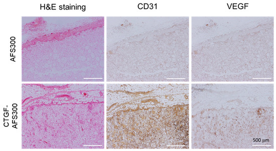 Immunohistochemical analysis of angiogenesis. H&E staining was performed on tissue sections. Thin sections were also immunostained with CD31 and VEGF as a marker of endothelial cells (Brown DAB staining). Cells were penetrated both AFS and CTGF-loaded AFS. CTGF(1000)-AFS300 displayed a higher density of cells including vessels. Scale bars indicate 500 μm, respectively.