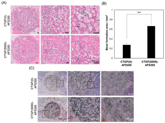 Photomicrographs of histological sections stained with H&E and Villanueva bone staining in CTGF(0)-AFS300 and CTGF(5000)-AFS300, eight weeks after the operation. (A) In contrast to the CTGF(0)-AFS300, CTGF(5000)-AFS300 contained numerous cells. New bone formation was observed in CTGF-loaded AFS. Scale bars indicate 200 μm, respectively. (B) The newly-formed bone of CTGF(0)-AFS300 or CTGF(5000)-AFS300 were measured by NDP view software. Bar graphs represent means ± SD. ** Significantly different (p < 0.01) from the value with CTGF-HAp(0). (C) Upper panels showed CTGF(0)-AFS300 and lower panels represent CTGF(5000)-AFS300. Center panels show high magnification of the square area in left panels. Right panels represent high magnification of the square area in center panels. Scale bars indicate 500, 200, 100 μm, respectively.