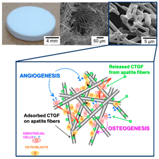At the central region of the replacements, larger engineered tissues lead to necrosis due to the lack of blood supply. To overcome these problems, a variety of strategies have been addressed to construct the vascular networks within implanted tissues for the achievement of successful integration with the host tissue [21,22,23]. In bone tissue engineering, calcium phosphates have been used as scaffold materials. In this study, we have fabricated three-dimensional apatite-fiber scaffold with well-controlled pore sizes and porosity. Previous studies show that pore size at the range of 200–350 m is found to be optimum for bone tissue in-growth. Additionally, scaffolds involving both micro and macro porosities can perform better than only macro porous scaffold [22]. Our scaffold has been constructed with different pore size, pore-size distribution, pore type (closed or open pore) and interconnectivity. Additionally, fiber-shaped HAp, with a preferred orientation to the c-axis, can adsorb the protein including CTGF [24].