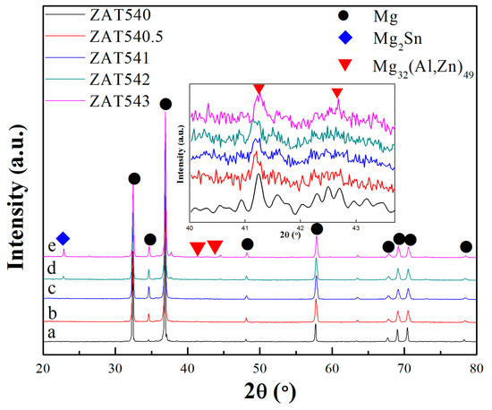 XRD results (Figure 2) showed that only α-Mg and Mg32(Al,Zn)49 phases appeared where the Sn content was less than 2 wt %, while for the alloys with Sn contents of 2 wt % (ZAT542) and 3 wt % (ZAT543), Mg2Sn diffraction peaks appeared and the diffraction peak intensities were enhanced as the Sn content increased. Formation of the Mg2Sn phase was primarily due to the higher electronegativity differences between Mg–Sn (0.65) than that of Sn–Al (0.35) and Sn–Zn (0.31) [34].