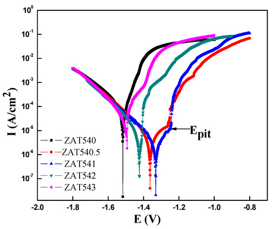 There was obvious passivation behavior in the extruded ZAT54x alloys due to the formation of an oxide film on the alloys’ surface. However, the anticorrosion properties of oxide film are undesirable because the anodic current densities rise slowly with the increasing anodic potential below the breakdown potential (Epit as marked on the curves) due to the porous structure of oxide films [38].