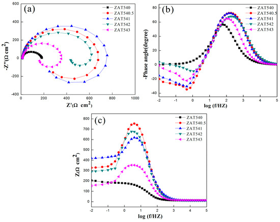 (a) Nyquist plots of ZAT54x alloys. (b) Bode plots of phase angle vs frequency for ZAT54x alloys. (c) Bode plots of impedance vs frequency for ZAT54x alloys.