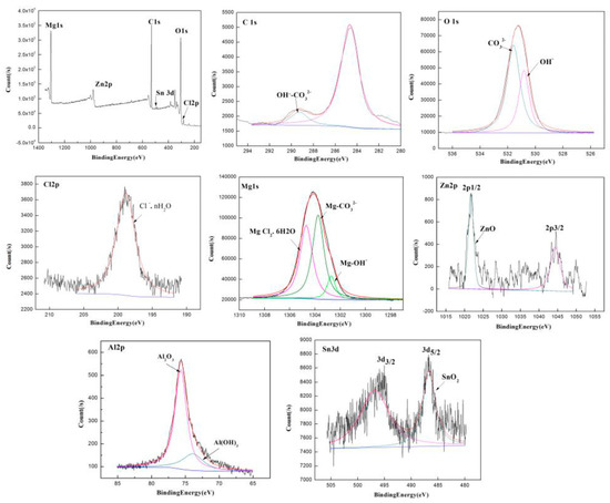 The corrosion products of the extruded ZAT543 alloy immersed in 3.5 wt % NaCl for 48 h were detected by XPS, and the result is shown in Figure 10. There was C, O, Cl, Mg, Zn, Al, and Sn in the corrosion products of the ZAT543 alloy. As for C 1s, the binding energy was approximately 284.5 and 289.5 eV, corresponding to adventitious C and CO32−. As for O 1s, there were two peaks corresponding to OH− and O2−, which proved the existence of hydroxide and oxide. As for Cl 2p, the peak at 198.5 eV originated from Cl−·nH2O, which means that there were basic chloridion compounds in the corrosion products. In the case of the Mg 1s spectrum, the peaks at approximately 102.7, 1303.8, and 1304.8 eV originated from Mg(OH)2, MgCO3, and MgCl2·6H2O, respectively. For Zn 2p, there were two peaks corresponding to Zn 2p1/2 and Zn 2p3/2. This means that there was ZnO in the corrosion products. For the Al 2p spectrum, the binding energy was approximately 75.6 and 73.9 eV, corresponding to Al2O3 and Al(OH)3. For Sn 3d, there were two peaks in the Sn 3d spectrum consistent with Sn 3d3/2 at 494.9 eV and Sn 3d5/2 at 486.4 eV. This implies there was SnO2 in the corrosion products. Thus, the surface of the corrosion layer mainly consisted of a large amount of Mg(OH)2, MgCO3, and MgCl2·6H2O and a little Al2O3, Al(OH)3, ZnO, and SnO2.