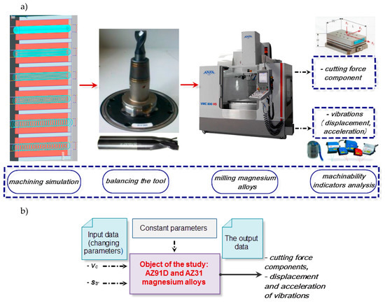 In the search for optimisation in manufacturing, it is the selection of production materials that may eventually prove to play the leading role. The use of magnesium alloys significantly contributes to reducing the design weight and boosts savings in production and maintenance costs. On the other hand, the use of Mg alloys also has a beneficial effect on an inherent component of machining—effective removal of machining allowances—which is often carried out by means of milling. Forces occurring in machining are critical to the performance and quality of the process itself, which is why they are typically considered among the key “functional” machinability parameters. With respect to “physical” and additional absolute machinability parameters, the following may be distinguished; damping characteristics of materials, the amplitude and frequency of vibrations. In unfavourable conditions, different the cutting force components acting on the workpiece may cause uncontrollable deformation of the workpiece during machining, e.g., leading to the reduction of the undeformed chip thickness, which subsequently results in the increase in the cutting force. Then again, as a result of the increased shear energy per unit of volume, both the amount of subtracted workpiece material and the value of cutting forces increase [1]. Adhesion and build-up may similarly cause fluctuation in the components of the cutting force and cause insufficient surface finish quality or shape and dimensional accuracy. Compared to the machinability of other materials, magnesium alloys are characteristically quick and effective to cut, which enables executing the process at large depths of cut and high feed.