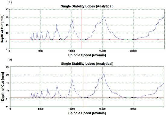 Despite the numerous advantages, there are certain drawbacks of the SLD technique. The SLD data is derived from machine tools in their downtime. As a result, there are factors that cannot be accounted for in the analysis, such as the rigidity of the spindle system, the effect of excessive heat of machine tool parts in operation and other workpiece-related factors (e.g., mass-related damping properties of the workpiece, material defects or the variable diameter of cut) [40,42]. It is important that the obtained SLD results be cross-referenced with the cutting data from dynamic milling tests.