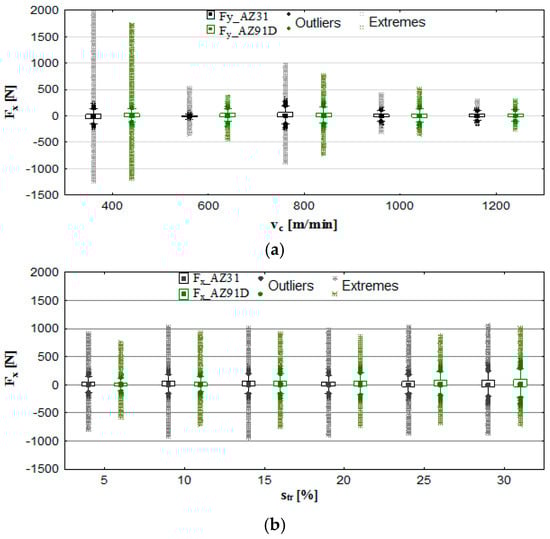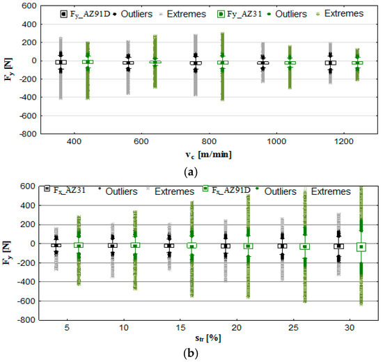 To an extent, Figure 6a appears to confirm the previous findings: more favourable machining parameters (as exemplified by fewer outliers and extremes) occur in the range of vc = 1000 to 1200 m/min. However, in the case of trochoidal step (Figure 6b), the findings differ. Here the Fy component develops the minimum values for p = 5% of the cutter diameter. This is a consequence of the increase in the str parameter and the simultaneous increase in the diameter of the area of cut. In this case, therefore, it is preferable to use high values of vc speed and small trochoidal steps: str = 5–15% for AZ31 alloy and p = 5–10% for AZ91D alloy.