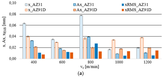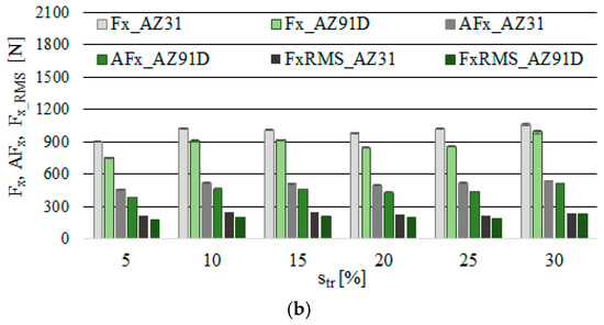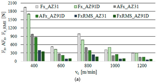 Similar tendencies as in Figure 4 are clearly visible in Figure 5, where the component Fx, its amplitude AFx and the normalised force coefficient RMS value Fx_RMS generally show a tendency to decrease practically over the entire tested cutting speed range (except for vc = 800 m/min). Maximum Fx was recorded for the AZ31 alloy amounted to Fx = 1940 N and the minimum Fx = 291 N, in the AZ91D alloy: maximum Fx = 1707 N and minimum Fx = 301 N. In str analysis, its values fluctuated in the range of 901 to 1020 N (for AZ31) and approximately 753 to 991 N (for AZ91D). Lower values of the Fx component were generally observed in AZ91D alloys.