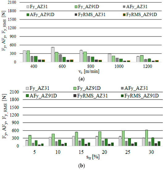 - Modification of either of the tested machining parameters, vc or str affects the values of the cutting force components: Fx is shown to increase when vc = 1200 m/min—Fx ≈ 300 N (in both tested magnesium alloys) and str = 30%—Fx ≈ 1000 N (in both tested magnesium alloys), compared with Fy for vc = 1200 m/min—Fy ≈ 200 N (for AZ31) and Fy ≈ 235 N (for AZ91D), while for str = 30%—Fy ≈ 313 N (for AZ31) and Fy ≈ 620 N (for AZ91D).