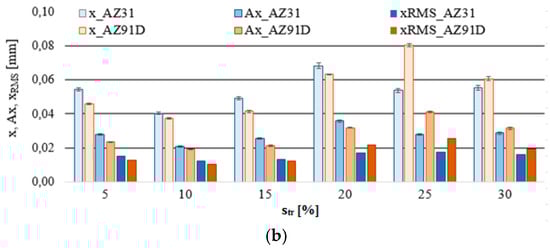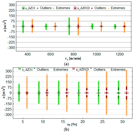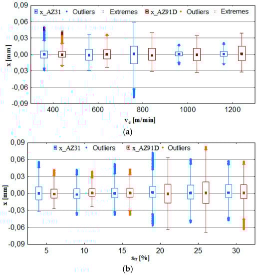 Figure 8a indicates that the most favorable conditions regarding vibration displacement occur when milling is performed at vc = 1000–1200 m/min. Considering AZ91D alloy, one may see no outliers or extremes, which clearly suggests very good machining stability throughout the entire range of cutting speeds vc. In the case of AZ31 alloy, although outliers/extremes are admittedly present in graphs, the box plot range is the smallest for the entire analysed range of vc. Figure 8b shows that trochoidal step change leads to an increase in the range of recorded values and outliers/extremes for vibration displacement. What follows from these observations is that it is more advantageous to repeatedly increase the cutting speed rather than the trochoidal step, due to the fact that higher values of vc translate to a more favorable range of x. The most unfavourable range of displacement vibrations x occurs at str = 20–30%.