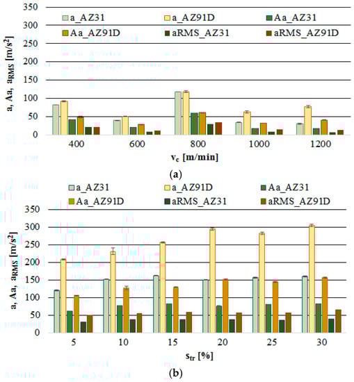 Figure 11a further confirms the previous observations regarding the most favourable cutting parameters as occurring at the speed range of vc = 600 m/min and vc = 1000–1200 m/min. At the given levels of vc, there are practically no instances in which the level of 50 m/s2 would be exceeded. The trochoidal step change (Figure 11b) results in the increase in a, Aa and a_RMS. Therefore, it is in another instance that it becomes confirmed that machining efficiency is boosted by increasing the cutting speed vc. In this case, higher values of vibration acceleration were observed for the foundry alloy AZ91D.