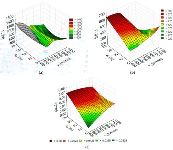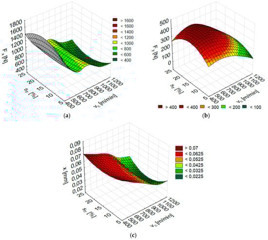 Numerical results of (a) Fx, (b) Fy and (c) x depending on the cutting speed vc and trochoidal step str for AZ31 alloy (Fx: RBF 2-5-1, Fy: RBF 2-6-1, x: RBF 2-7-1).