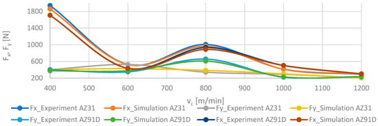 Comparison of experimental and numerical results depending on the cutting speed vc for trochoidal step str = 15% for Fx and Fy components of the cutting force in milling of AZ31 and AZ91D alloys.