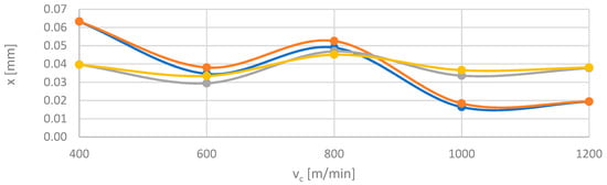 With respect to vibration displacement, the analysed output data were: displacement of vibrations x, their amplitude Ax and the normalised force coefficient RMS value of vibration displacement x_RMS. The analytical procedure for vibration displacement resembled that of the cutting force, i.e., the first stage consisted in computing the box plot charts, which subsequently provided the data for the bar graphs and next for determining the standard deviation. These relationships (x, Ax and x_RMS) are presented in the function of the technological cutting parameter—cutting speed vc and the additional parameter is trochoidal step str.