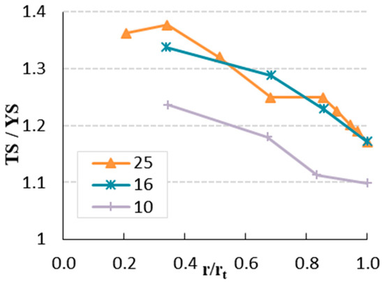 Figure 8 illustrates the strain-hardening potential, the ratio of TS to YS (ft/fy). The ratio ranges between 1.1 (r/rt = 1.0) and 1.23 (r/rt = 0.35) for bars with diameter of 10 mm. The strain hardening for bars with diameter of 16 mm ranges from 1.17 (r/rt = 1.0) to 1.34 (r/rt = 0.34) and for bars with a diameter of 25 mm it ranges between 1.17 (r/rt = 1.0) and 1.36 (r/rt = 0.21). It is observed that strain hardening starts to increase in the modified shape of the rebar by peeling (high strain-hardening potential) compared to unmodified rebars. The strength is higher for specimens with a low value of TS/YS.