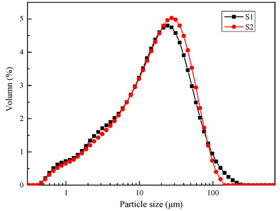 The particle size distributions of the BFS were shown in Figure 1 and Table 2. The particle size distribution is reported to be one of the factors that strongly affects the reactivity of raw materials. With no significant difference, the mean particle diameters (Table 2) of BFS1 and BFS2 were 17.9 and 19.0 μm, respectively. The BET surface areas of BFS1 and BFS2 were 905.3 and 843.4 m2/kg, respectively.