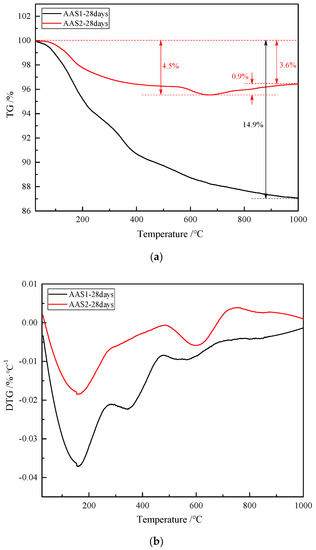The compressive strength of AAS highly depends on the amount of hydration product after the BFS has been activated by the alkali solution. As described above, BFS1 contains a higher content of basic oxides, which can accelerate its dissolution and generate more hydration product, mainly as C–(A)–S–H, at an early stage. This could lead to a more heterogeneous matrix in the microstructure (see Figure 7 in Section 3.5). However, the Fe content in BFS2 is higher, hindering the leaching of Al3+, Si4+ and Ca2+ ions, which are the main constituent parts of the hydration product. Therefore, the hydration of BFS2 lasts for a long time, even after 27 days. This is why the growth rate of the compressive strength for AAS2 is larger than that of AAS1 at the later stage (see Figure 8 in Section 3.6). A thermogravimetric analysis has been used to signify the amount of hydration production in many studies. From Figure 5, the mass loss for AAS1 is about 5.4% before 200 °C, mainly resulting from the loss of the adsorbed or interlayer water of C–(A)–S–H and the decomposition of ettringite. This number is larger than AAS2, whose mass loss is approximately 1.9%. The larger weight loss during this temperature period agrees well with the compressive strength testing result (see Figure 8) and microstructure analysis (see Figure 7). The larger formation of C–(A)–S–H and ettringite should be related to higher strengths and a more compact matrix.