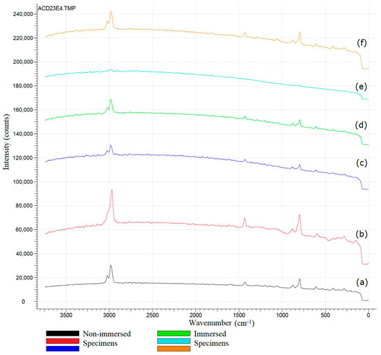 In the process of Raman spectroscopy, the excitation wavelength was applied through 531.747 nm, grating T1: 600 g/mm BLZ = 500 nm, and center wavelength of 595.222 nm. The vertical shift speed was 16.25 µs and the horizontal shift speed was 0.033 MHz. The characteristic Raman peaks for PVDF–SSPF have been shown and repeated on three different sites in both types of specimens. Not all signals can be easily attributed to specific group frequencies in both the FTIR and Raman tests. In the given results, the initial analysis of data indicated that the SSPF is characterized by specific bands ranging between 200 cm−1 and 1700 cm−1. The PVDF is likely characterized by the major bands ranging between 2000 cm−1 and 3400 cm−1. Raman spectroscopy supports differentiating fibers based on their composition. This result is also maintained in other studies [33]. Additionally, the Raman shifts observed in the given results indicate that signals ranging between 600 cm−1 and 1700 cm−1 can be assigned to conjugated C=O or C=C stretching modes. Signals ranging between 800 cm−1 and 1000 cm−1 can be designated to the C=N stretching mode of the composites. However, the Raman spectrum peak for PVDF–SSPF of both specimens ranged between 2950 cm−1 and 3000 cm−1. The peak corresponds to the ring-stretching modes of the cellulose structure [34] or composite interactions as possible anticipation. Alternatively, the smaller peaks that appeared between 900 cm−1 and 1200 cm−1 are more likely to represent the C‒O‒C stretching vibrations from carbohydrates and C‒C ring-breathing, this was justified by [31,32]. The most prominent bands are likely to appear in the range of 2900 cm−1 and 3100 cm−1. These peaks can be accredited to O–CH3, C–CH3, and CH2 stretching modes [32]. Additionally, minimized peaks were observed in the Raman spectra of immersed specimens, especially in specimen (e). This was due to the water content in composites which made peaks appear shorter than those of non-immersed specimens. Both shifts provide strong evidence that the fiber did interact with the polymer matrix. However, numerous studies have investigated the polymer-fiber composites using Raman spectroscopic techniques, including diverse types of polymers and fibers. Some tests, however, relied on numerous assumptions. Although C‒O can provide a reasonable infrared intensity, Raman spectroscopy occurs most intensely for symmetric vibrations such as C‒C and C=C. Infrared spectroscopy is allegedly more suited to polar groups in which a displacement of charge occurs between electropositive and electronegative atoms such as N‒H and O‒H [35].