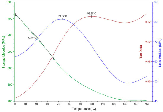 The storage modulus curves provide valuable insights to further comprehend the stiffness of composites as a function of temperature. The curves can also be useful in evaluating the molecular basis of mechanical properties as they might behave sensitively to structural changes, e.g., fiber matrix interfacial bonding, degree of cross-linking, and molecular weight. Under certain circumstances, the loss modulus can increase with fiber loading. The maximum heat dissipation occurs at the temperature where E” is at its maximum value [38]. The storage and loss modulus are given in Figure 4.