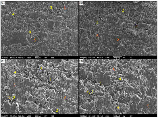 Cross-sectional SEM image of immersed composites. (a,b) Two cross-sectional views from the first perspective. (c,d) Two cross-sectional views from the second perspective. (1) Void, (2) fiber matrix debonding, (3) matrix disarrangement, (4) porosity, (5) good surface adhesion, (6) good matrix bonding.