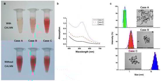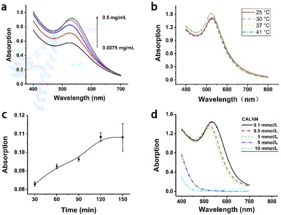 In addition, the effect of concentration of CALNN on the preparation of AuNPs was investigated as well, since the presence of CALNN is closely related to the formation of AuNPs (Section 3.1). It can be seen from Figure 3d that, concentrations of CALNN in the range of 0.1~1 mmol/L have little influence on the preparation of AuNPs. DLS analysis (Figure S2) indicated that these AuNPs have similar sizes, but 1 mmol/L CALNN provides the best monodispersity of AuNPs (polymer dispersity index, PDI = 0.19). Higher concentrations of CALNN restrict the formation of large AuNPs, because all of the Au3+ formed chelates with CALNN. As a result, the gold nucleus formation and CALNN coating happened simultaneously, forming AuNPs smaller than 1 nm as the DLS measurements show. Consequently, 1 mmol/L CALNN was selected for the optimized preparation of peptide-coated AuNPs.