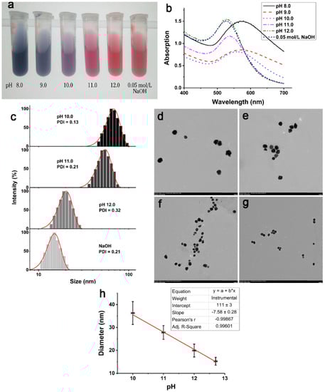 It is well known that the color and SPR absorption of AuNPs are related to the size of the AuNPs [,]. To further confirm the size of AuNPs, DLS and TEM analyses were performed. The AuNPs obtained at pH 8.0 and 9.0 appear to be unstable and agglomerate, probably due to the fact that the size of the AuNPs is too large for the CALNN ligand. On the other hand, AuNPs obtained in the pH range of 10.0 to 12.7 are well dispersed with a PDI of less than 0.32 and the display pH-related sizes as expected (Figure 5c–g). Furthermore, when the size of AuNPs measured from TEM images was plotted versus pH, a linear relationship was obtained (Figure 5h). As shown in Figure 5h, the size of AuNPs decreases linearly with the increase of pH in the range from 10.0 to 12.7, with slope = −7.58 ± 0.28, intercept = 111 ± 3, and the coefficient of determination R2 reaching 0.996. As a consequence, the size of AuNPs can be controlled precisely in the range of 15~35 nm according to the linear equation. That is different from and demonstrates the advantages of the method proposed here over the general protocol for controlling the size of metal NPs, which is usually done by changing the concentration of reducing reagents. Therefore, the method for one-step preparation of peptide-coated AuNPs proposed here not only provides a convenient route to produce nanoparticles, but also provides a tool for metal NP size-related studies and applications.
