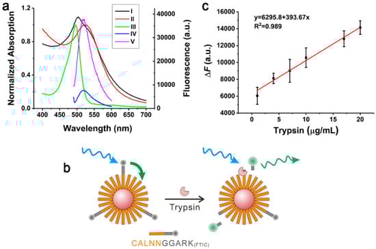 (a) Normalized UV–vis absorption spectra of (I) functional AuNPs that labeled with FITC, (II) CALNN-coated AuNPs, (III) FITC, and the (IV) fluorescence spectra of functional AuNPs without and (V) with trypsin. (b) Scheme of the fluorescence-based trypsin detection with functional AuNPs. (c) The standard curve for trypsin detection with functional AuNPs.