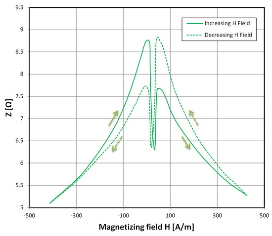 Exemplary results of impedance Z versus magnetizing field H characteristics for the MELTA® MM-5Co alloy are presented in Figure 2. As can be seen, the characteristics measured one way (with increasing magnetizing field values) had significant asymmetry, and this is mirrored for the decreasing field values (a switch in the asymmetry direction is visible), forming the distinct GMI hysteretic response. The right-side shift of the peaks is due to the uncompensated Earth’s magnetic field component.