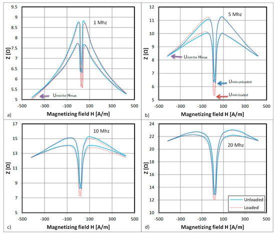 Dependence of sample impedance on the magnetizing field H applied longitudinally for (a) a 1 MHz driving signal; (b) a 5 MHz driving signal; (c) a 10 MHz driving signal; and (d) a 20 MHz driving signal. The blue line indicates the characteristic for zero strain and the red dashed line indicates the characteristic for fully applied strain. The blue and red arrows indicate the Umin voltage drop minima for the strained and unstrained samples.