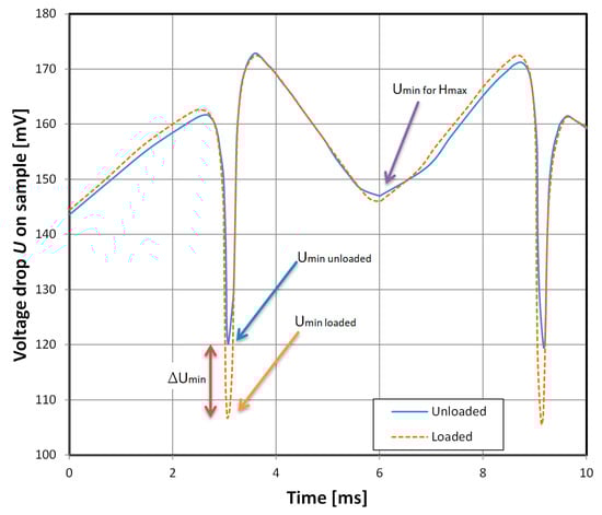 Measured HF voltage drop U signal for a 5 MHz, 400 mV RMS driving signal. The minimum of the voltage drop signal Umin (corresponding to arrows in Figure 3b) is the strain-dependent part of the measured waveform.