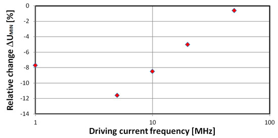 The 5 MHz driving signal was chosen due to the higher relative change ∆Umin of the Umin signal. A graph of relative change of ∆Umin signal dependence on driving current frequency is presented in Figure 5. Lower frequencies were omitted due to the voltage drop U minima for maxima of the applied H field. For the investigated material, only the near-zero H field part of the GMI characteristic is interesting from a strain-sensing point of view. Furthermore, the USI signal of the proposed sensor, which is directly proportional to ∆Umin, was measured with help of a demodulator probe, negative peak detector circuit, and voltmeter. The strain was increased to the critical value (ϵ = 1240 × 10−6), above which the sample was prone to breaking.