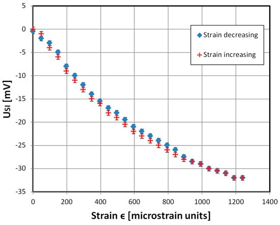 The characteristic of the USI signal for the sample on strain is presented in Figure 6 and shows some hysteresis for the increasing-decreasing strain measurement series, which is typical of magnetoelastic systems [37]. This is mainly due to the magnetoelastic hysteresis of the material. There are proposed solutions for compensating for similar problems [38,39]. The gauge factor however equals 120 for critical strain (ϵ = 1240 × 10−6) and 270 in the high sensitivity region for ϵ = 248 × 10−6. This was calculated with the following formula: