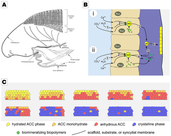 (A) Shell mineralization occurs in two compartments, the mantle and the extrapallial space. Reprinted from Marin et al., ref. [6], with permission from Elsevier. (B) Two generic mineralization pathways possible within the second compartment. (1) Uptake of ions from the environment. (2) Ion storage in intracellular compartments, e.g., as amorphous calcium carbonate (ACC) nanoparticles. (3) Exocytosis of calcium carbonate can occur by redissolution to ions or by the export of the stored ACC granule. (5) ACC colloids can reform from ions, under process-guidance of biopolymers. (6) Attachment of nanoparticles to the growth site. Reprinted from Wolf et al., ref. [19], with permission from Elsevier. (C) Transformation of hydrated ACC to crystalline calcite; starting with highly hydrated ACC, losing water, and by first forming monohydrate and then ACC, before crystallization. Reprinted from Wolf et al., ref. [19], with permission from Elsevier.