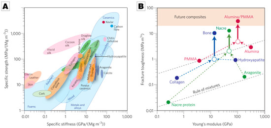 The remarkable toughening and strengthening effects caused by this hierarchical organization and the hybrid and composite layout of biominerals can best be demonstrated by Ashby plots [5,77], see Figure 3. Continuing with the molluscan example, it becomes clear that shells are five times stronger than pure calcite and aragonite, although the density essentially remains constant. This demonstrates that biominerals have overcome the “conflict between strength and toughness” of man-made materials [117].