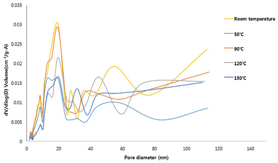 - The pore size distributions of the specimens prepared at room temperature and 90 °C were largely in the mesoporous range, which is advantageous for adsorbing contaminants.