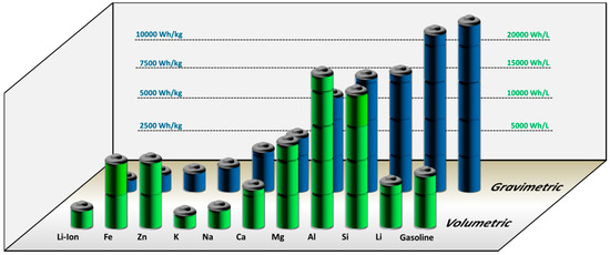 Applying Equation (1), the specific energies of Fe, Zn, K, Na, Ca, Mg, Al, Si and Li range from 1229 to 11430 Wh/kg (excluding oxygen uptake), which is summarized in Table 1 along with the open-circuit voltages of the corresponding MABs. Comparing the energy content of the reduced materials, the blue columns in Figure 1 highlight that the weight-specific values of all nine considered elements exceed the specific energy of present and projected Li-ion battery cathode materials, although losses due to electrode balancing in a Li-ion full-cell are not even included yet. Moreover, in Figure 1 it can be seen that the specific energy of Li is almost comparable to the specific energy of gasoline, which is as high as 11600 Wh/kg compared to 11430 Wh/kg for Li, making Li-O2 batteries particularly appealing for practical applications [40,41]. However, when taking the mass densities (ρMe) of the individual elements into account, their distinct order according to the specific energies changes significantly, in favor of other elements than Li. Caused by its comparatively low mass density, the potential energy density of Li is relatively small compared to other elements. In fact, Fe, Zn, Mg, Al, and Si exhibit theoretical energy densities in the range from 9653 to 21837 Wh/L, which are (much) higher than those for Li and gasoline (6104 Wh/L and 8677 Wh/L). Accordingly, from the battery volume-perspective, the former five elements appear far more interesting than Li, if at least a good fraction of the theoretical energies is achieved on full-cell level.