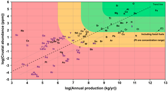 Estimated crustal abundance for all natural elements on Earth plotted as a function of annual production. Elements which are main economic products of their respective ores are shown in black font, while purple font is used for the elements, which are mostly byproducts of other elements. Green color indicates abundant, readily available elements. Light green and orange indicate less abundant elements. Red color indicates scarce elements. (Reprinted and adapted with permission from RSC Adv., 2, 7933–7947, ©2012, The Royal Society of Chemistry.) [58].
